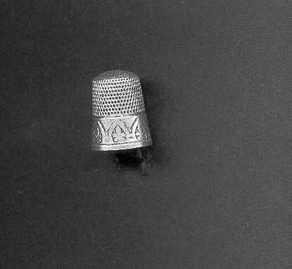 Silver thimble, small size with wide patterned band. Fleur de lys pattern around band. Size 6 stamped on band. Knurling to and over top. Simon Bros. logo inside with Sterling Silver around.