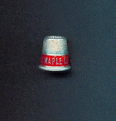 Aluminum Advertising thimble with red band. Rolled vertically lined rim . Advertising ÒUse Maple Leaf Flour *Ó No marks.