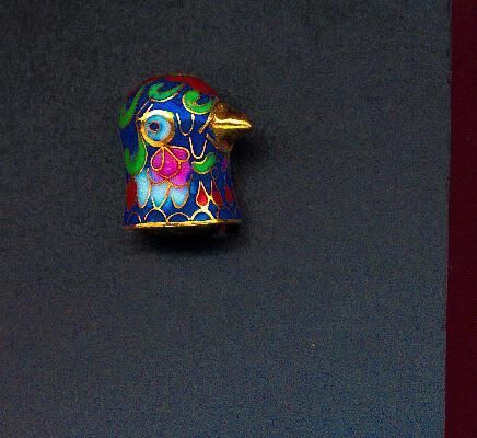 Novelty cloisonne himble in shape of birdÕs head. Gold beak and top with knurling. Bas ically royal blue on brass with many coloured cloisonnes. No marks.