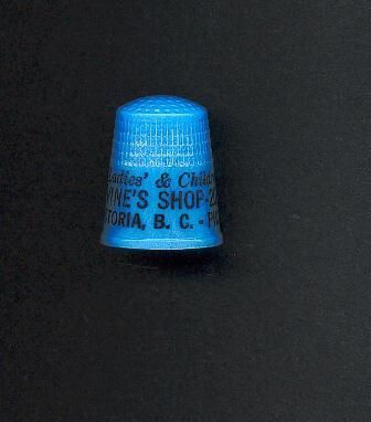 Blue plastic Advertising thimble with black printing. ÒLadies & ChildrenÕs Wear DevineÕs Shop 201 Menzies Victoria, B.C. - Phone 4-6208.Ó In circle on band is printed ÒPrinted in U.S.A.Ó
