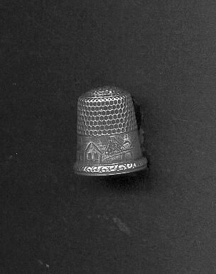 Silver thimble with Scenic band. Raised patterned rim. Wide band with scene - brick wall, trees, house, hill, sun. Knurling from band to and over top. Stamped Sterling and an anchor on band