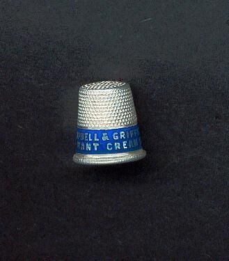 Aluminum Advertising thimble with rolled vertically lined rim and blue band. Advertising ÒCampbell & Griffin Ltd. Calgary Want Cream ShipmentsÓ Inside top B&B St. Paul.
