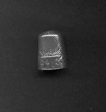 Silver thimble with wide band of pattern at rim. Pattern - a compound leaf, horizontally, with flower. Name ÒLauraÓ on band and size. Knurling above band worn or distorted. No Makers mark.