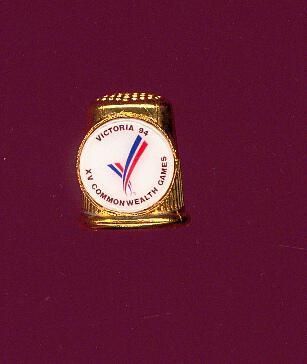 Souvenir thimble, gold coloured metal with added crest. Rolled rim, lower half of thimble vertical lines, top half plain, knurled top. Crest of Commonwealth Games Ô94 in Victoria B.C. White background with logo - a check mark in blue and red with Victoria Ô94 & XV Commonwealth Games.
