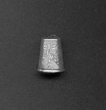 Silver thimble with rolled rim. Moonstone top with crack.Plain sides with 3 swags from top of thimble to rim. Initials MF between. Stamped near rim BH 830-S . Also seems to be a punch mark.Inside gilt.