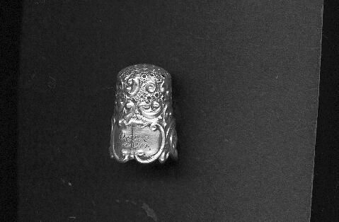 Embroidery thimble. Silver with all-over scroll design. Uneven rim. Cartouche with initials ERE. Inside apex Sterling * (star) 10 .
