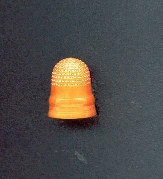 Vegetable ivory - coquilla nut - thimble. Lovely honey colour. Plain smooth shaped lower half, knurling to rounded top and over. No marks.