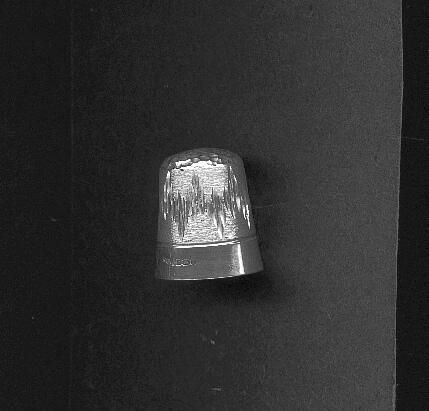 Modern silver thimble. Plain wide band with Hallmarks. Matte background with design of slashes. Irregularly knurled top. Hallmarks - WHN (Maker) Birmingham 1985