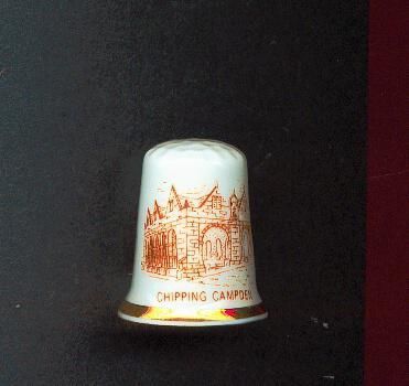 White glazed bone china slightly fluted thimble with gold rim. Decal of the Wool Market in ÒChipping CamdenÓ Inside printed Bone China Made in England.