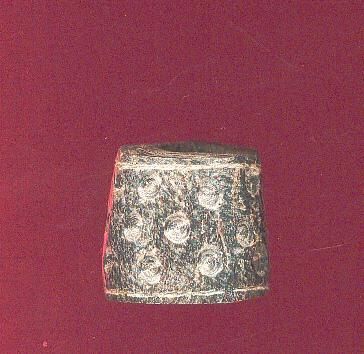 Large black thimble, tailorÕs style. 1Ó diameter at top. a 1/8Ó diam. at bottom. 3 rows indentations. Indentations are hand drilled. Thimble made of Horn.