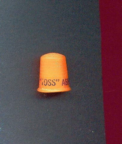 Plastic Political Advertising thimble. Orange-pink colour with black printing. Advertising ÒElect J.H. ÒTossÓ .AbbotÓ. Inside apex B&B St. Paul U.S.A.