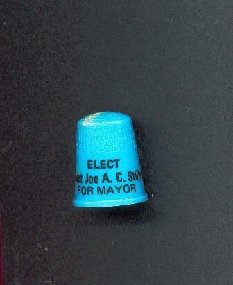 Blue plastic Political Advertising thi,mble with black printing. Advertising ÒElect Honest Joe A.C. Stiller For MayorÓ U.S.A.1 in apex.