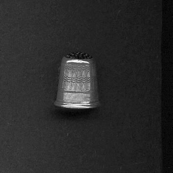 Modern silver thimble with ruby red stone on top. Rolled rim. Lined scallop pattern from rim to top. Marked in apex H.J. Sterling 4