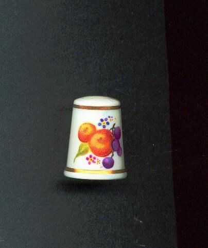 Bone china white glazed thimble with gold line at top and rim.. Hand painted design - fruit - apples, cherries cluster on ine sde. Other side has 2 cherries and the signature of ÒM. MunslowÓ. Inside Royal Worsester logo .