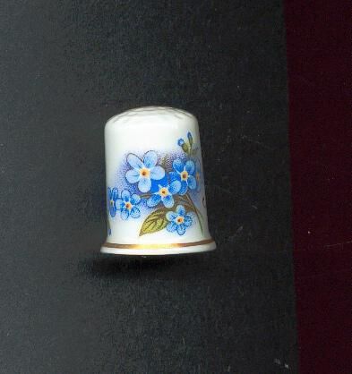 Whitebone china glazed thimble with gold line at rim. Souvenir thimble. ÒAlaskaÓ on back. Cluster of blue Forget-me-nots on front. Inside stamped ÒBone China British MadeÓ.