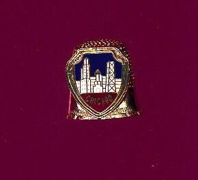 Souvenir thimble of the city of Chicago. Silver coloured metal that doesnÕt react to a magnet. Decorated rim. Wide plain band with narrow slanted lines just above rim. Shield raised but part of thimble, with tall white buildings , blue sky, red at base with Chicago. Inside top ÒFortÓ and a C in a circle.