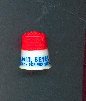 Plastic Advertising thimble. Creamy white with red top blue printing. Advertising ÒMiller, Bain, Beyer & Co. Wholesale Dry Goods 1025 Arch St. PhilaÓ Insidetop St.Paul U.S.A.
