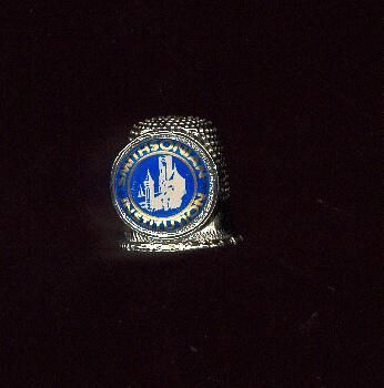 Souvenir thimble, silver coloured metal -silver plate, with protruding disc. Decorative rim, plain band above. Built-in disc, round with white buildings, blue background and ÒSmithsonian InstitutionÓ around .Inside apex stamped Fort. and a C in circle.