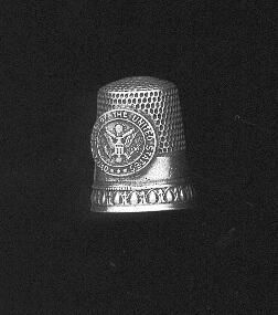 Souvenir pewter thimble with added disc. Narrow band of pattern - arrows and ovals at rim. Wider plain band above then knurling to and over top. Applied disc has the ÒSealÓ and words ÒGreat Seal of the United StatesÓ. No other marks.