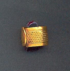 Brass wide Oriental sewing ring. Expandable . Plain narrow band at both top and lower edges, knurling betwen bands. Star design on overlap. No marks.