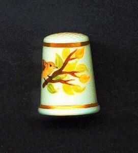 White glazed bone china hand painted thimble. Gold bands at top and rim. Bird, wren-like, on branch with green leaves, yellow flowers. On other side small branch with green leaves. Signed F. Round. Inside Royal Worcester logo, black.