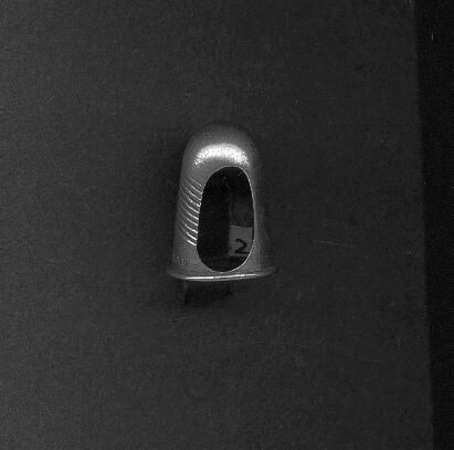 Silver Finger Guard. Domed top. Completely covers finger except for an oval cut-out on back. Rolled rim. Shallow scored lines. Stamped PatÕd Nov.5,(18)95.