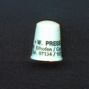 White plastic Personal Advertising thimble, black lettering. Advertising ÒC&W Pressler 7101 Ellhofen, Germany Tel.07134/10110ÕÓ Inside apex U.S.A.18.