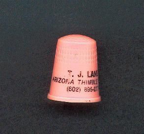 Pink plastic Personal and Advertising thimble. Block pr inting, waffle knurling. Advertising ÒT.J.Lane Arizona Thimble Maker (602) 895-2771Ó Inside apex U.S.A. 12.