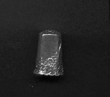 Hand crafted sterling siver thimble. Tall, slightly fluted scalloped rim. Hand punched top. Design of tall buildings, arch of St. Louis, MO. and caravan with ILMO above rim. Stamped in apex TJ.