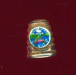 Souvenir thimble. Silver coloured metal thimble with narrow rim.Narrow bands - 2 -of vertical lines above and below a plain band. Stamped on plain band 16 (maybe size) and Germany. Coloured disk added to main body of thimble with salmon, trees, mountain and ÒCampbell River B.C.Ó around top.