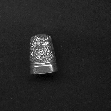 Silver coloured thimble - probably cupro-nickel or silverplated. Wide plain band with trademark of 3 thimbles in a shield. Pattern above band of cross hatched diamonds with cut -out diamonds alternsting around , then chrysanthenums to and over top.