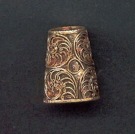 Silver thimble with all over filagree decoration on body of thimble. Side seamed. Hand crafted. Depressed top with small coral stone in center. Tall thimble.