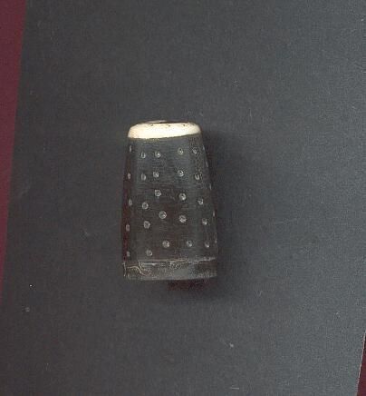 Tall horn thimble ,rounded body with hand punching. Body is black,top is white with a blackand whte design in center, out;ined in gold.