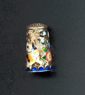 Tall silver thimble with coloured enamel pattern. Sidee seamed, set in knurled top. Cat, flowers, butterfly in enamel colours around body of thimble. Half circles of blue at rim. No marks.