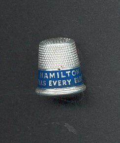 Aluminum Advertising thimble with blue band. Advertising ÒHamilton Hydro Shop Sells Every Electrical ApplianceÓ Stamped inside apex B&B St.P.