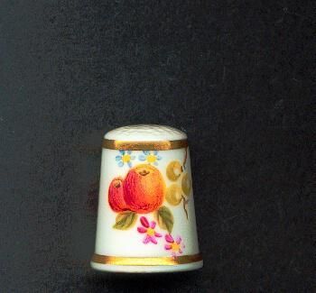 Hand painted bone china white glazed thimble with narrow gold band at top and rim. Painted fruit - apples, peaches?, leaves and small green fruits, with blue and red small flowers - one side. Other side has vine with fruit and signature J. Royner. Inside Royal Worcester logo
