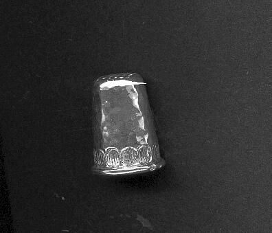 Modern silver thimble, hand crafted. Rolled rim, narrow band of pattern above rim - circles with vertical lines within. Hammered body of thimble. Top knurled.Marked on trim .999 and makers mark.