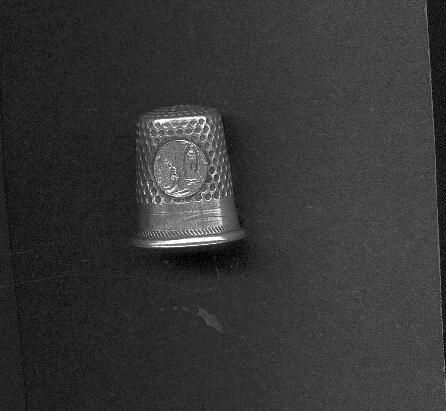 Silver thimble with added disc. Rolled rim with narrow band of diagonal lines above,tthen a wider plain band before knurling to and over top. Size marked center top. Religous disc added - kneeling figure and standing figure of Virgin Mary.