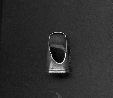 Silver Finger Guard. Plain except for 2 indented lines above lower rim. Oval finger shape cut out of thimble, top to nearly rim. No marks.