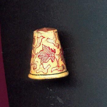 Wide slightly fluted lacquered wooden thimble. Fine black line defining rim/.Overall pattern of leaves and stems done in gold with red outlining the veining. Inside painted black. No marks.