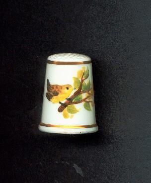 Hand painted white bone china glazed thimble. Gold band top and near rim. Hand painted bird ,brown ,yellow breast, tail up (wren?) on bough.Small bough on back with signature ÒF. RoundÓ. Inside logo of Royal Worcester.