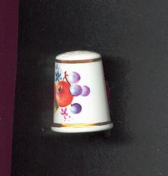 White glazed bone china hand painted thimble, slightly fluted. Gold bands at top and rim. Painting of fruit - peaches, plums, with flowers main picture. Smaller one on reverse of stem with 2 plums and the signature of ÒS.WaldronÓ.Logo of Royal Worcester inside in black.