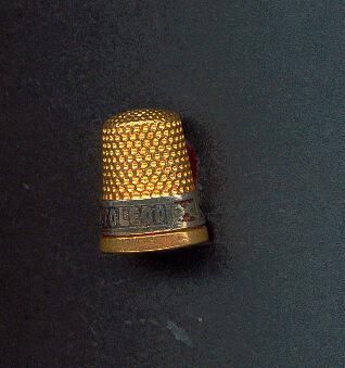 Brass Souvenir thimble from Spain. Band of steel above rim with design and words Toledo. No marks.