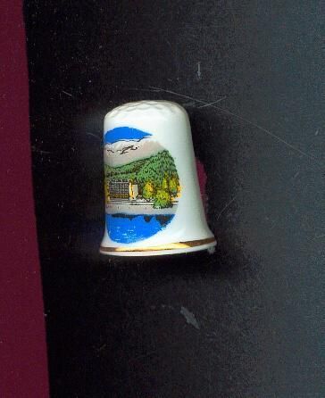 White glazed bone china Souvenir thimble. Sligtly fluted with gold line at rim. Oval decal of lake, hotel, trees and sky. On reverse Ò The Harrison Hot Springs Hotel British Columbia CanadaÓ Inside stamped Birchcroft Fine Bone China Made in Great BritainÓ.