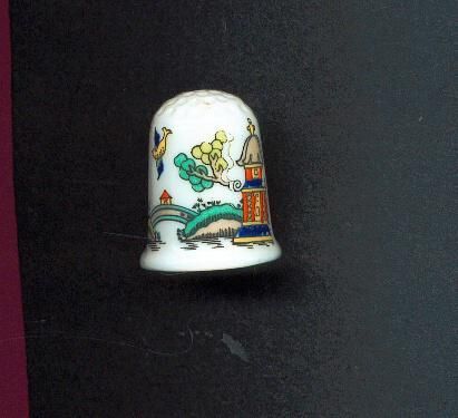 White glazed bone china thimble with Oriental scene. Rounded knurled top. Scene of hills, buildings, trees birds and bridges. Buildings have enameling on them. Inside thimble a Crown and ÒCoalport Bone China Made in England Est. 1750Ó