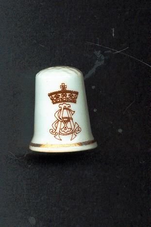 White glazed Souvenir ( Commemorative?) thimble slightly fluted at tim. Gold band at rim. One side has a Crown above entwined initials E and Vor A. Other side has a banner with Sandringham. These are in a gold colour. Inside logo of a cathedral and ÒM.G.Fine Bone China Norwich EnglandÓ in black.