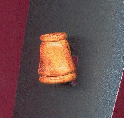 Wooden thimble,nicely shaped. Indented near top. Flat top with sign incised . Indented also near rim. Fluted from top to rim Mid brown shades.