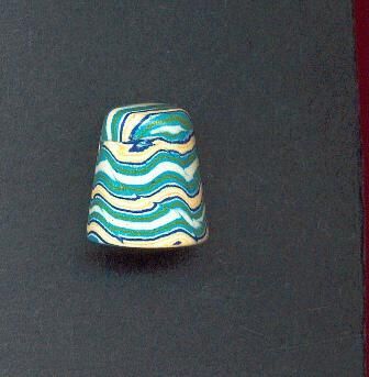 Spun porcelain hand made thomble. Wavy lines of greeny-blue, yellow and white all over. Smooth - no knurling.Matte finish.