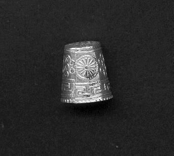 Silver thimble, side seamed, slightly fluted. At rim a row of beading, then a wide row of the Greek key design. From band to top the 7 Olympic rings alternate around with a radiating disc, Top is flat and knurled in a mesh form. Stamped 925 above the Greek key band.