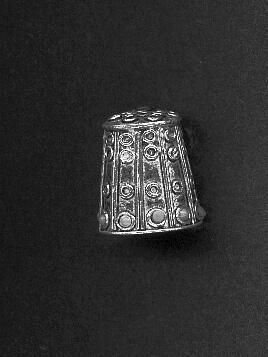 Silver panelled thimble. Heavy weight. Side seamed. Top has small pink stone in center with many small silver circles added around it instead of knurling. Ten panels around body of thimble ,double raised lines dividing. Four added metal circles each panel with ones at rim containing small turquoise stones.Stamped 925 inside apex.